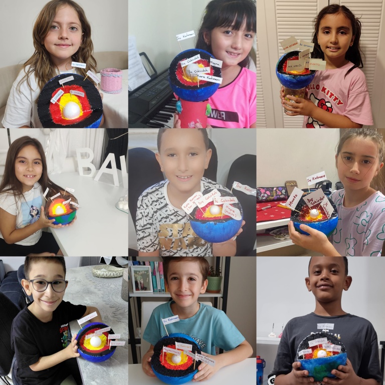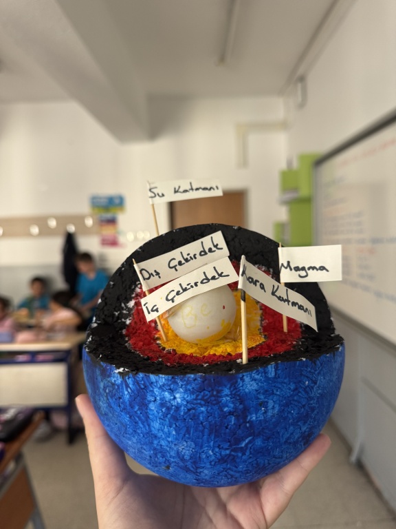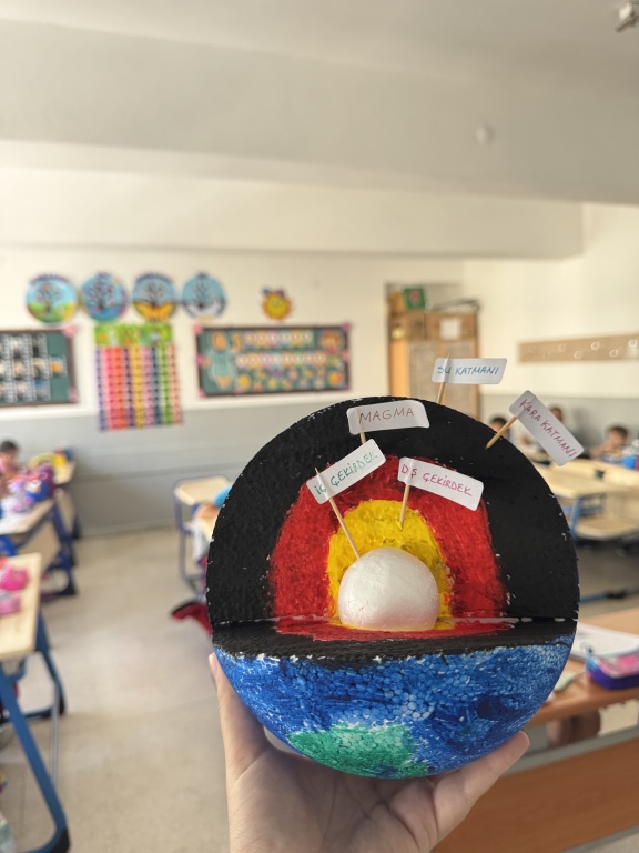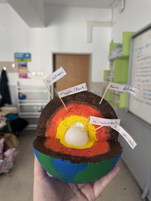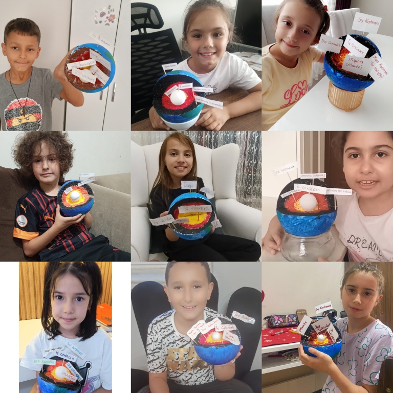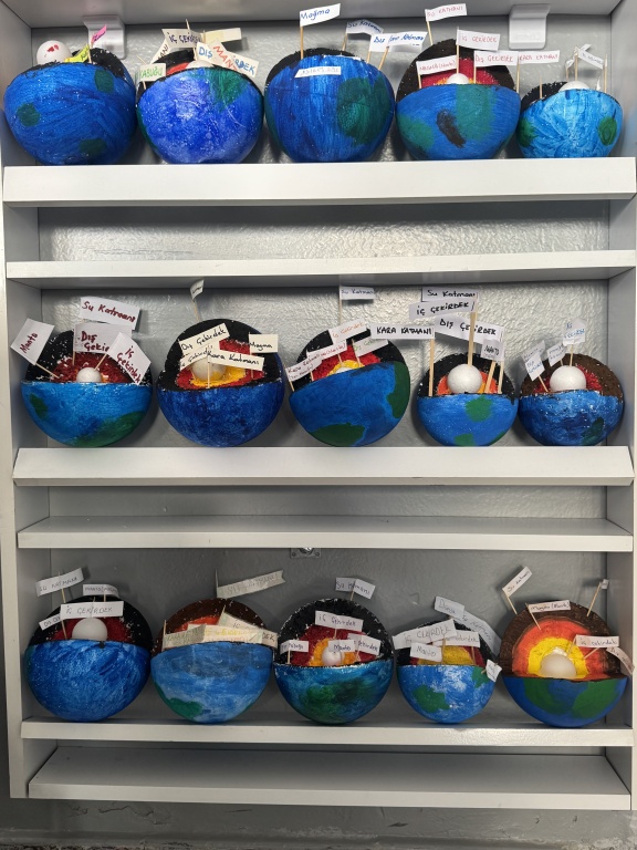 3/D sınıfı öğrencileri Fen Bilimleri dersinde işledikleri "Dünya'nın Katmanları" konusunu pekiştirmek için Dünya modelleri hazırlamıştır.