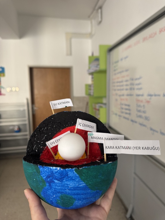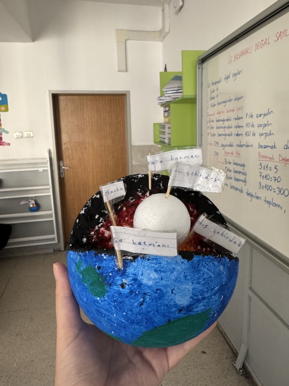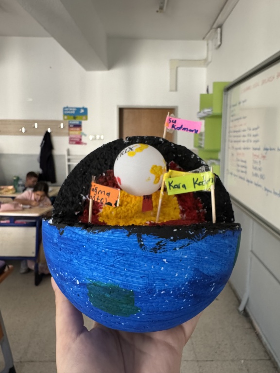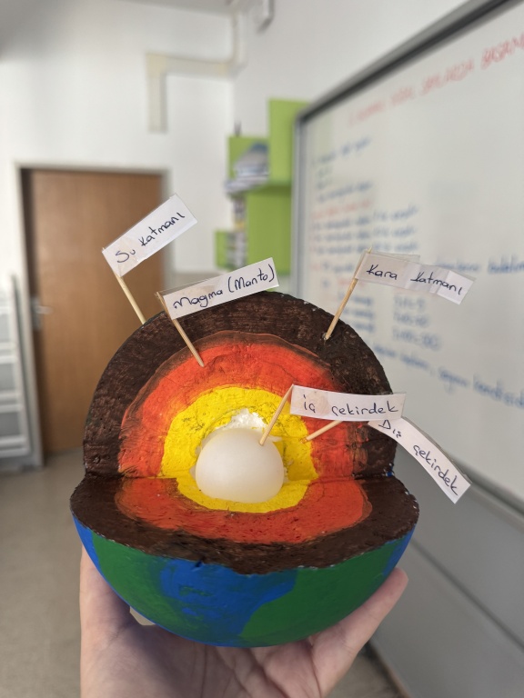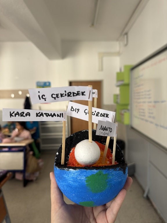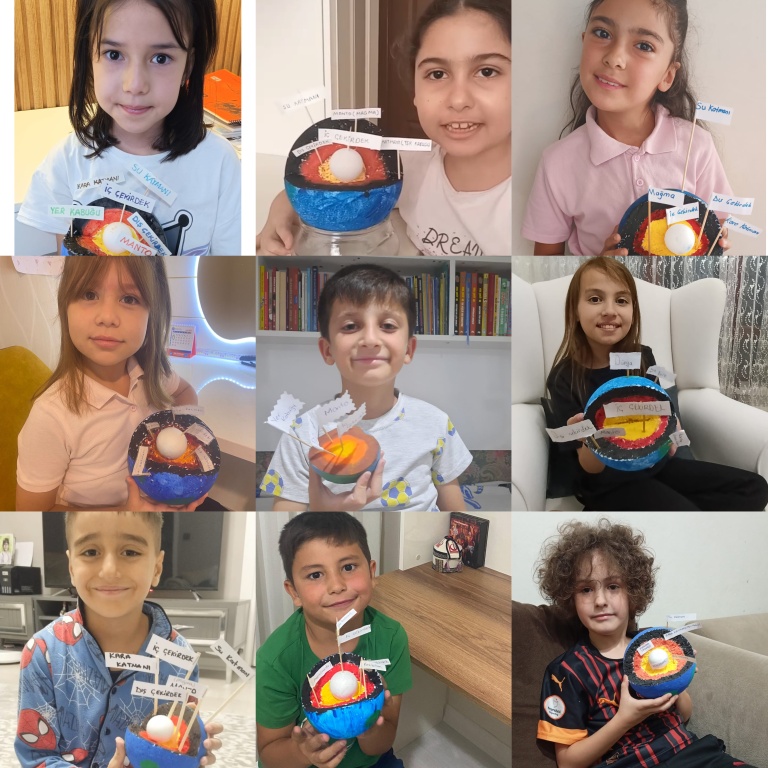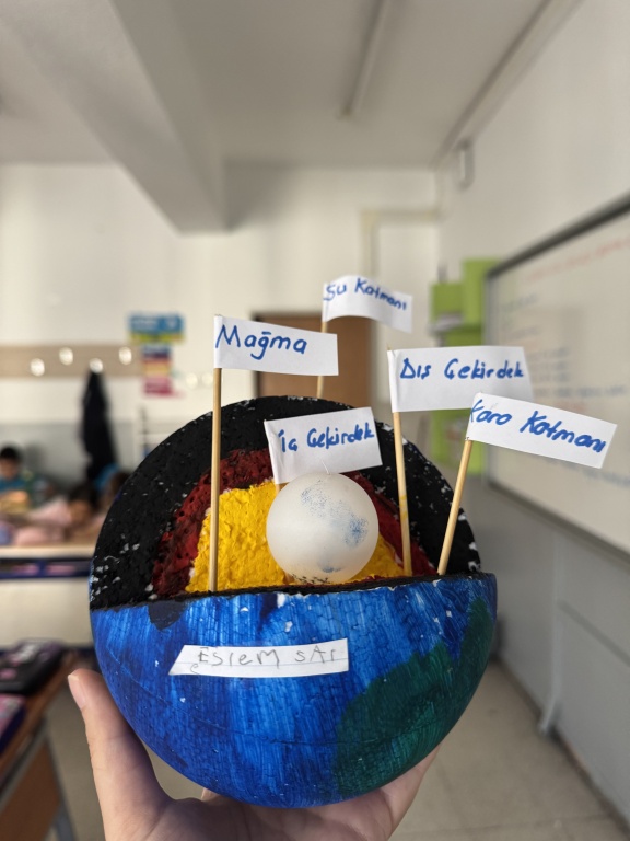 3/D sınıfı öğrencileri Fen Bilimleri dersinde işledikleri "Dünya'nın Katmanları" konusunu pekiştirmek için Dünya modelleri hazırlamıştır.